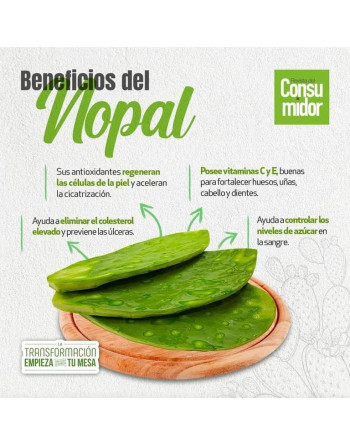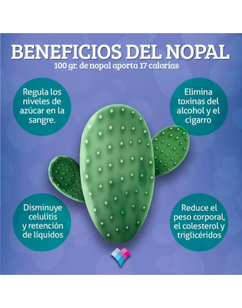 Nopal: depurador. Regula los niveles de glucosa en sangre. Reduce la absorción de grasa a nivel intestinal. Reduce peso. Anticancerígeno, antioxidante. Diabetes. Salud cardiaca.